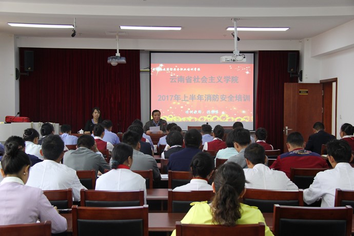 本站讯 为贯彻落实2017年夏季消防工作要求,做好云南社院火灾防控管理工作,坚决预防和遏制火灾事故的发生,消除火灾隐患,增强消防安全意识,提高火灾预防和自救能力,确保云南社院消防安全。6月30日,云南社院举办了2017年上半年消防安全知识培训和火灾自救逃生疏散演练及灭火实战演练。此次培训由学院党组成员、副院长彭立峰主持,云南尚云消防安全职业培训学校张婷婷老师主讲,学院部分教职工、教学服务中心全体员工、临街承租户及辖区护国派出所、景星社区相关人员参加培训。