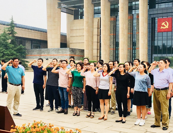 参观之后,在南湖革命纪念馆北广场宣誓墙前,全体党员右手握拳、面对鲜红的党旗,庄严宣誓,重温入党誓词,回望革命历史,牢记党的宗旨。