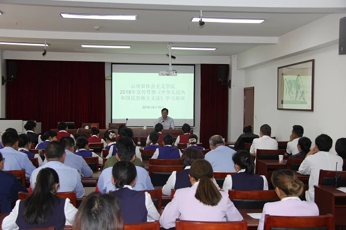 本站讯 6月15日,云南省社会主义学院举行反恐防恐宣教培训会。培训会由学院党组成员、副院长杨春禄主持,全体教职员工、临街铺面承租户、景星社区相关人员等100多人参加。