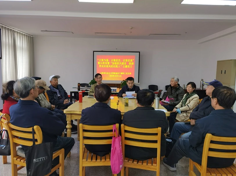 本站讯 为深入贯彻中央纪委“以案促改”的安排部署和省委的工作要求,深刻汲取黄毅严重违纪违法案教训,按照省社会主义学院《关于开展深刻汲取黄毅严重违纪违法案教训专题警示教育活动的实施方案》要求,10月11日上午,退休干部职工党支部开展“以案为鉴、以案促改、以案促建”警示教育暨“加强家风建设 做涵养良好家风的社院人”主题党日活动。