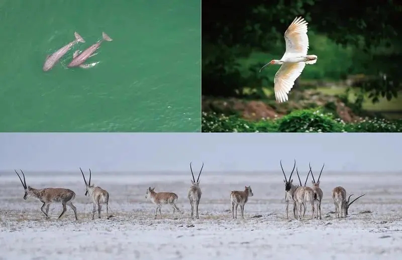 我国系统实施濒危物种拯救工程,多种濒危野生动植物得到有效?;ず突指础U馐且徽牌窗嬲掌鹤笊贤嘉?021年5月11日,在湖北省宜昌市江边,长江江豚在水中嬉戏(无人机照片,新华社记者 肖艺九/摄);右上图为2021年5月13日拍摄的陕西省汉中市洋县朱鹮生态园内的朱鹮(新华社记者 刘潇/摄);下图为2021年4月20日,藏羚羊在三江源可可西里地区活动(新华社记者 吴刚/摄)。