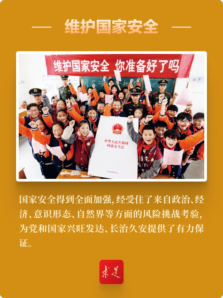 ——党把安全发展贯穿国家发展各领域全过程,注重防范化解影响我国现代化进程的重大风险,坚定维护国家政权安全、制度安全、意识形态安全,加强国家安全宣传教育和全民国防教育,巩固国家安全人民防线,推进兴边富民、稳边固边,严密防范和严厉打击敌对势力渗透、破坏、颠覆、分裂活动,顶住和反击外部极端打压遏制,开展涉港、涉台、涉疆、涉藏、涉海等斗争,加快建设海洋强国,有效维护国家安全。