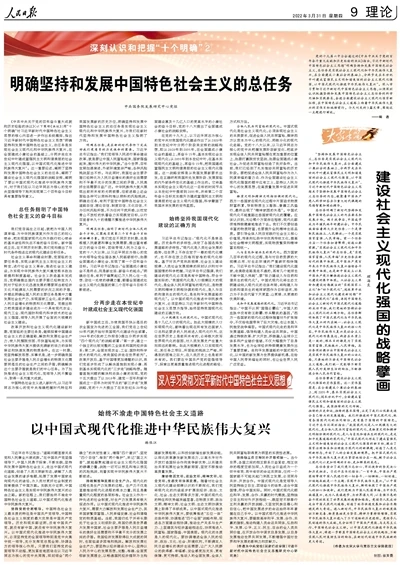 党的十九届六中全会通过的《中共中央关于党的百年奋斗重大成就和历史经验的决议》指出,习近平新时代中国特色社会主义思想“明确坚持和发展中国特色社会主义,总任务是实现社会主义现代化和中华民族伟大复兴,在全面建成小康社会的基础上,分两步走在本世纪中叶建成富强民主文明和谐美丽的社会主义现代化强国,以中国式现代化推进中华民族伟大复兴”。深入学习贯彻习近平新时代中国特色社会主义思想,必须深刻认识把握坚持和发展中国特色社会主义总任务的科学内涵和实践要求,奋进全面建设社会主义现代化国家新征程,在中国特色社会主义道路上向着中华民族伟大复兴的宏伟目标砥砺前行。今天刊发的3篇文章,围绕这一主题进行阐述。