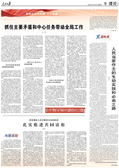 习近平新时代中国特色社会主义思想,明确新时代我国社会主要矛盾是人民日益增长的美好生活需要和不平衡不充分的发展之间的矛盾,必须坚持以人民为中心的发展思想,发展全过程人民民主,推动人的全面发展、全体人民共同富裕取得更为明显的实质性进展。深入学习贯彻习近平新时代中国特色社会主义思想,必须深刻认识新时代我国社会主要矛盾的转化,进一步明确解决当代中国发展主要问题的根本着力点,坚持不懈推进高质量发展、创造高品质生活,不断满足人民对美好生活的向往。今天刊发的3篇文章,围绕这一主题进行阐述。
