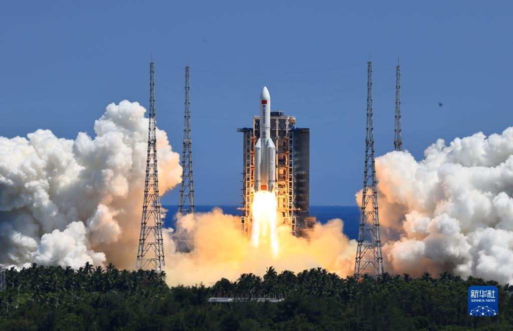 搭载问天实验舱的长征五号B遥三运载火箭,在我国文昌航天发射场点火发射(2022年7月24日摄)。新华社记者 李刚 摄