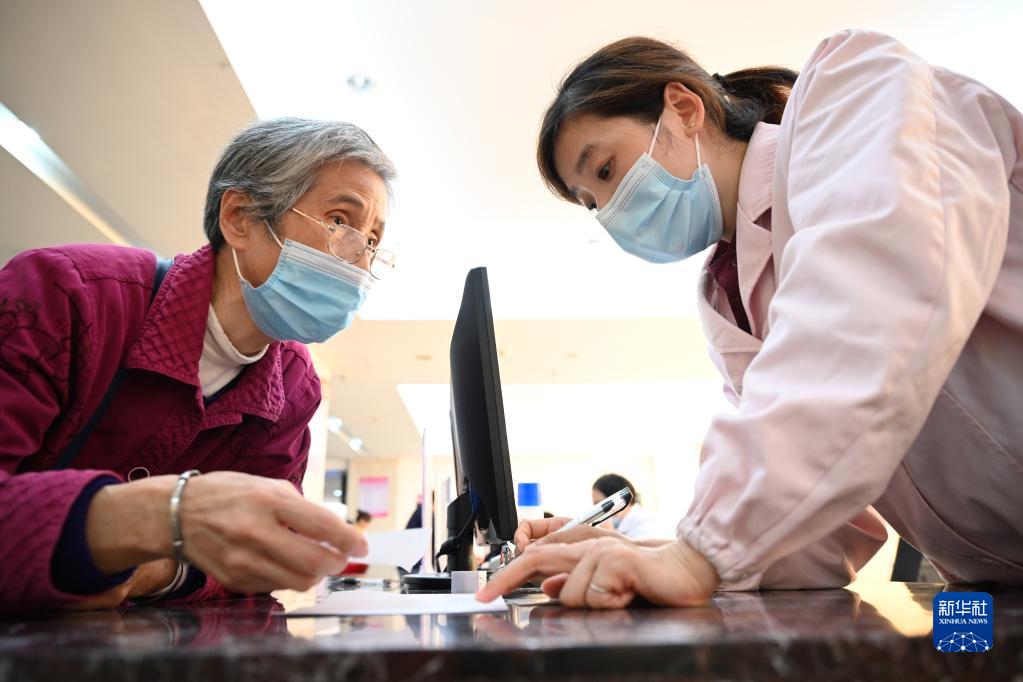 福建省三明市第一医院的医保办工作人员(右)向前来咨询药品报销问题的居民讲解相关政策(2020年11月18日摄)。新华社记者 姜克红 摄