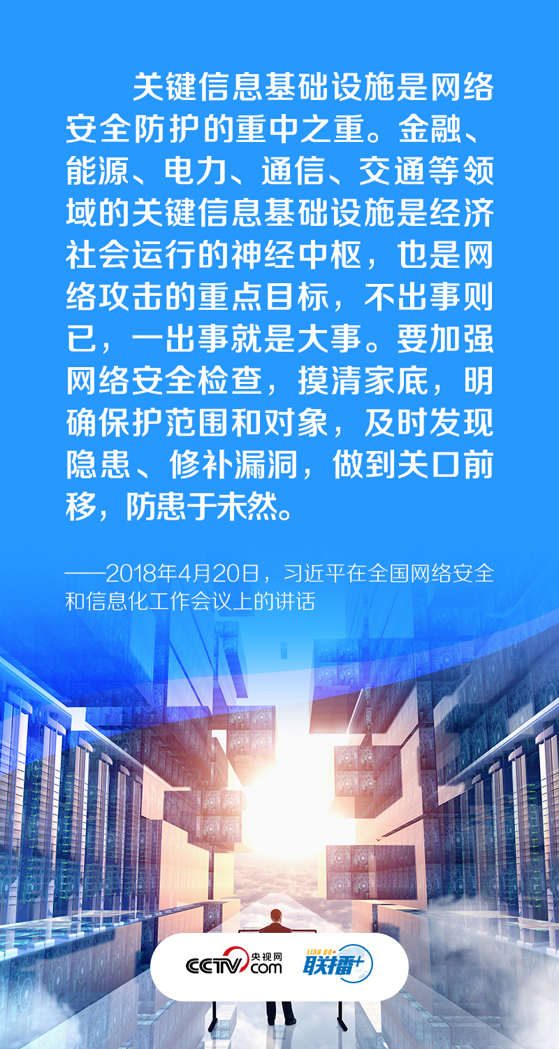 “金融、能源、电力、通信、交通等领域的关键信息基础设施是经济社会运行的神经中枢,是网络安全的重中之重,也是可能遭到重点攻击的目标?!毕敖阶苁榧乔康鳎丶畔⒒∩枋┦峭绨踩阑さ闹刂兄?,“我们必须深入研究,采取有效措施,切实做好国家关键信息基础设施安全防护”。