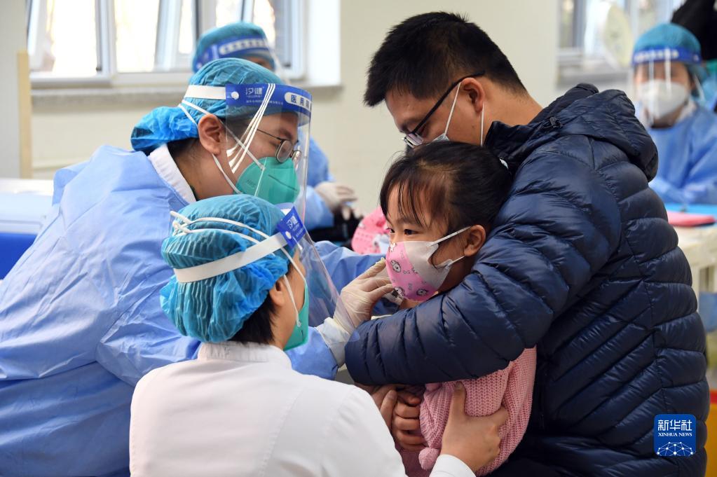 在北京市海淀区学院路街道新冠疫苗接种点,医护人员为一名小朋友接种新冠疫苗(2021年11月13日摄)。新华社记者 任超 摄