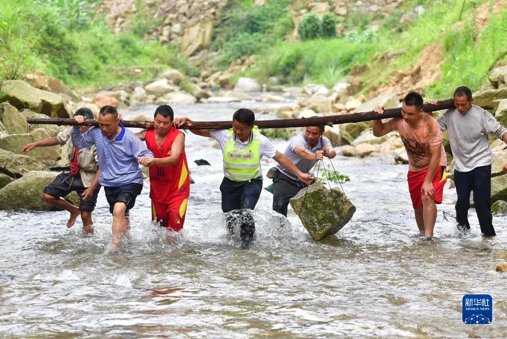 在位于黔桂交界大苗山深处的乌英苗寨,驻村第一书记韦桂华(右四)、党员梁成兵(右三)、梁志新(左二)带领村民维修河堤(2019年6月30日摄)。新华社记者 黄孝邦 摄
