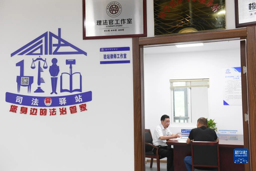 在浙江省湖州市吴兴区八里店镇三合片区党群服务中心“司法驿站”,律师志愿者(左)在提供法务咨询(2020年7月21日摄)。新华社记者 翁忻旸 摄