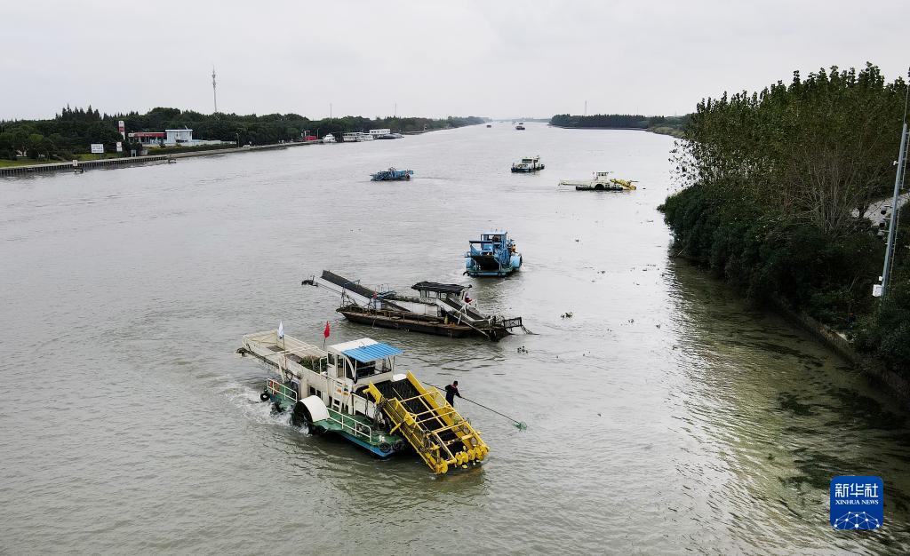 苏浙沪三地的保洁船在太浦河水域联合清理水面浮游植物(2020年10月15日摄,无人机照片)。当日,来自苏州市吴江区、上海市青浦区和嘉兴市嘉善县的三名河长在位于长三角生态绿色一体化发展示范区的苏浙沪交界水域太浦河流域附近开展联合巡河活动。新华社记者 方喆 摄