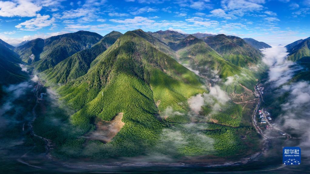 武夷山国家公园武夷断裂带峡谷内云雾缭绕,村庄若隐若现(2020年12月1日摄,无人机照片)。新华社记者 姜克红 摄
