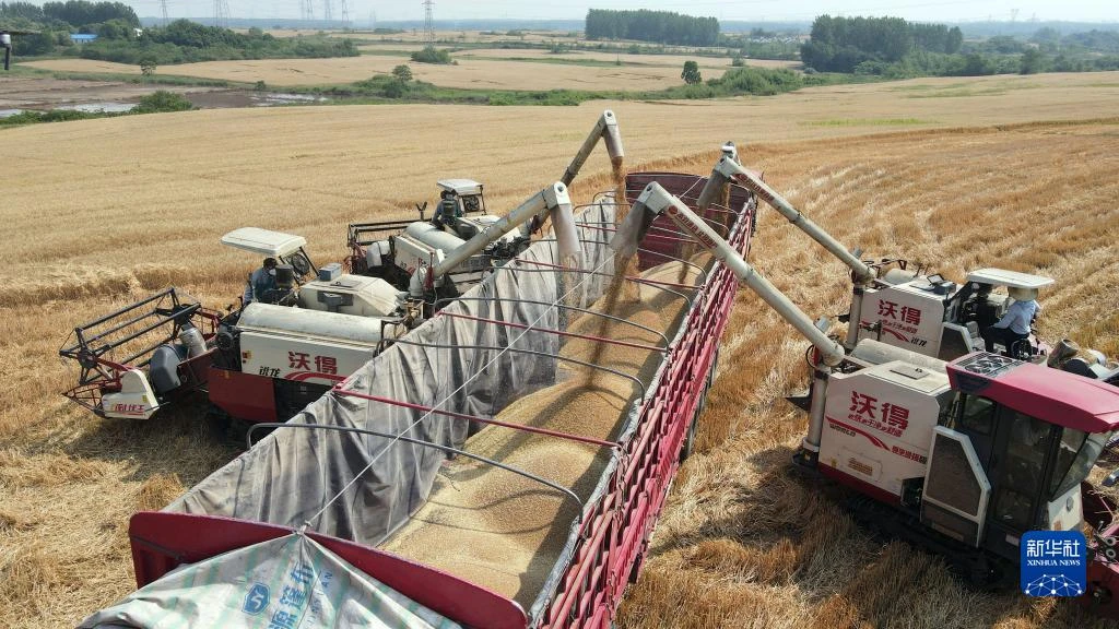 在安徽省合肥市蜀山区小庙镇段冲村麦田里,收割机将小麦装车(2022年5月25日摄,无人机照片)。新华社记者 周牧 摄