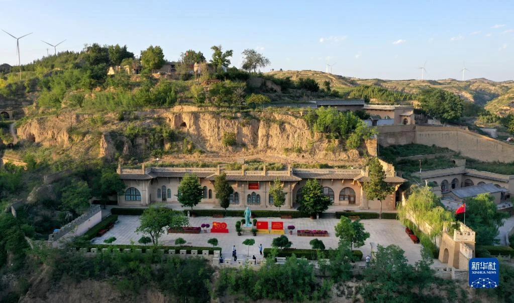游人在陕西省榆林市米脂县杨家沟革命旧址参观(2021年9月10日摄,无人机照片)。新华社记者 陶明 摄