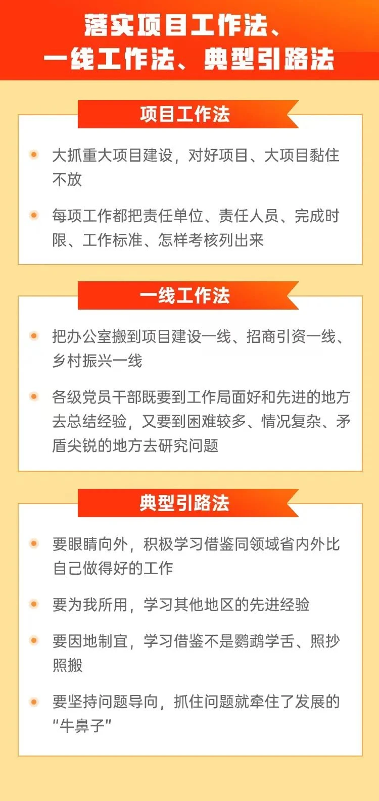《规定》强调,要大力推行项目工作法、一线工作法、典型引路法,让每项工作都能够实起来落下去。