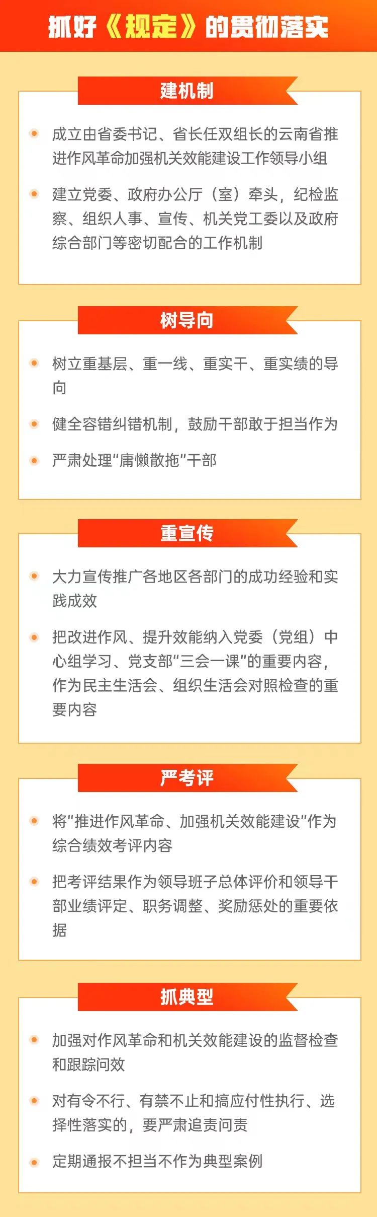 一是建机制。为抓好《规定》贯彻落实,成立由省委书记、省长任双组长的云南省推进作风革命加强机关效能建设工作领导小组,建立党委、政府办公厅(室)牵头,纪检监察、组织人事、宣传、机关党工委以及政府综合部门等密切配合的工作机制,不断推进作风革命加强机关效能建设。二是树导向。树立重基层、重一线、重实干、重实绩的导向,健全容错纠错机制,鼓励干部敢于担当作为。严肃处理“庸懒散拖”干部,对在贯彻执行党的路线方针政策和决策部署中,庸碌无为、作风散慢、遇事推脱不担当、工作不用心不用力不负责的干部,坚决果断调整处理。三是重宣传。大力宣传推广各地区各部门的成功经验和实践成效,发现培育典型、总结宣传典型、大力推广典型,形成示范引领、比学赶超的良好氛围;把改进作风、提升效能纳入党委(党组)中心组学习、党支部“三会一课”的重要内容,作为民主生活会、组织生活会对照检查的重要内容。四是严考评。将“推进作风革命、加强机关效能建设”作为综合绩效考评内容,科学设置考评指标,强化平时考评工作;把考评结果作为领导班子总体评价和领导干部业绩评定、职务调整、奖励惩处的重要依据。五是抓典型。加强对作风革命和机关效能建设的监督检查和跟踪问效,用好明查暗访、典型问题曝光,打好整治作风问题的“组合拳”,对有令不行、有禁不止和搞应付性执行、选择性落实的,要严肃追责问责。定期通报不担当不作为典型案例,让“躺平式干部”躺不住、让混日子的没有市场。