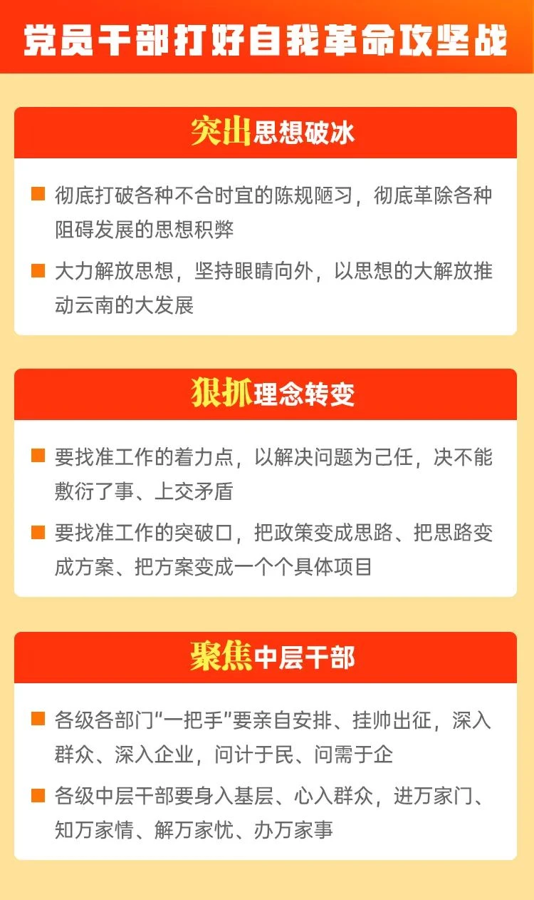 一是突出思想破冰,必须强力推进思想观念革故鼎新。云南发展不够快、不够好,根子还是思想解放不够,不敢想、不敢闯、不敢试。干部干部,干字当头,当干部就是要干活,就是要担当尽责、有所作为,决不能坐而论道、光说不练,混日子、当懒汉;要争做实干家、实践者,决不能当旁观者、当看客,更不能做“评论家”。省委、省政府部署开展作风革命、效能革命,首先就是要求各级党员干部进行一场深刻的思想上的自我革命,彻底打破各种不合时宜的陈规陋习,彻底革除各种阻碍发展的思想积弊,坚决破除安于现状的“守摊子”思想、地处边疆难有作为的消极思想、甘于落后的“跟跑”思想、不给资金项目就不干事的“等靠要”思想、“只要不出事,宁可不干事”的“太平官”思想、盲目乐观自我满足的狭隘思想,全面提振干事创业的精气神。要求全省广大党员干部用创新的思维、改革的办法谋全局、解难题、促跨越,跳出固化的发展思路,大力解放思想,坚持眼睛向外,学习借鉴先进省区的好经验好做法,开拓思路、开阔眼界、创新方法,用好“拿来主义”,结合实际情况,做到为我所用,以思想的大解放推动云南的大发展。