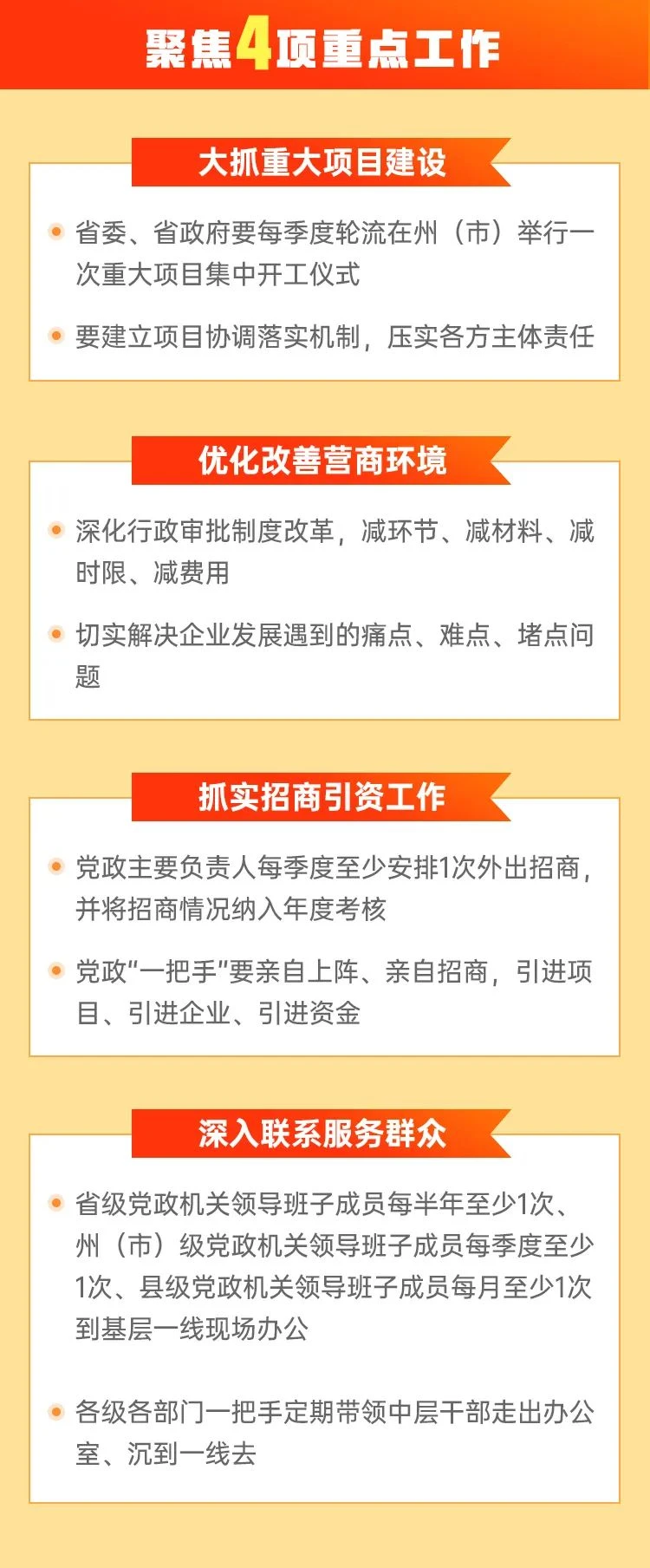 省委、省政府要求全省上下以革故鼎新的勇气、敢于担当的品格、抓铁有痕的力度,切实转变思想观念、改进工作作风、提升服务效能,办好让基层和群众有感的事情,提供让市场和企业满意的服务。针对大抓重大项目建设、大抓产业发展、大抓营商环境、大抓招商引资以及培育扶持潜力企业、深入联系服务群众等重点工作,《规定》提出了一系列具体明确、针对性强的硬杠杠、硬要求,对一些长期存在的堵点、痛点开出“药方”,打出了一套“组合拳”。