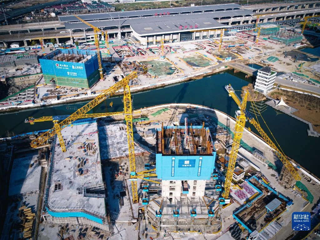绍兴北站TOD综合交通枢纽工程建设现?。?023年1月31日摄,无人机照片)。由中建三局承建的这项工程为浙江省重点工程,建成后将是集商务办公、科创研发、星级酒店等多重功能于一体的智慧型城市交通综合体。新华社记者 江汉 摄