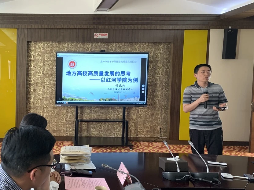 民革党员、红河学院发展规划中心主任杨亚河围绕贯彻落实中共二十大提出的人才强国战略要求,以《地方高校高质量发展的思考》为题,结合深化教育科技人才体制机制改革的调研成果,对州市高校主动融入和服务地方重点产业,培养符合云南省经济社会高质量发展需要的应用型人才,分享了红河学院的经验和做法。