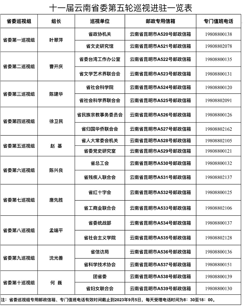 十一届云南省委第五轮巡视进驻一览表