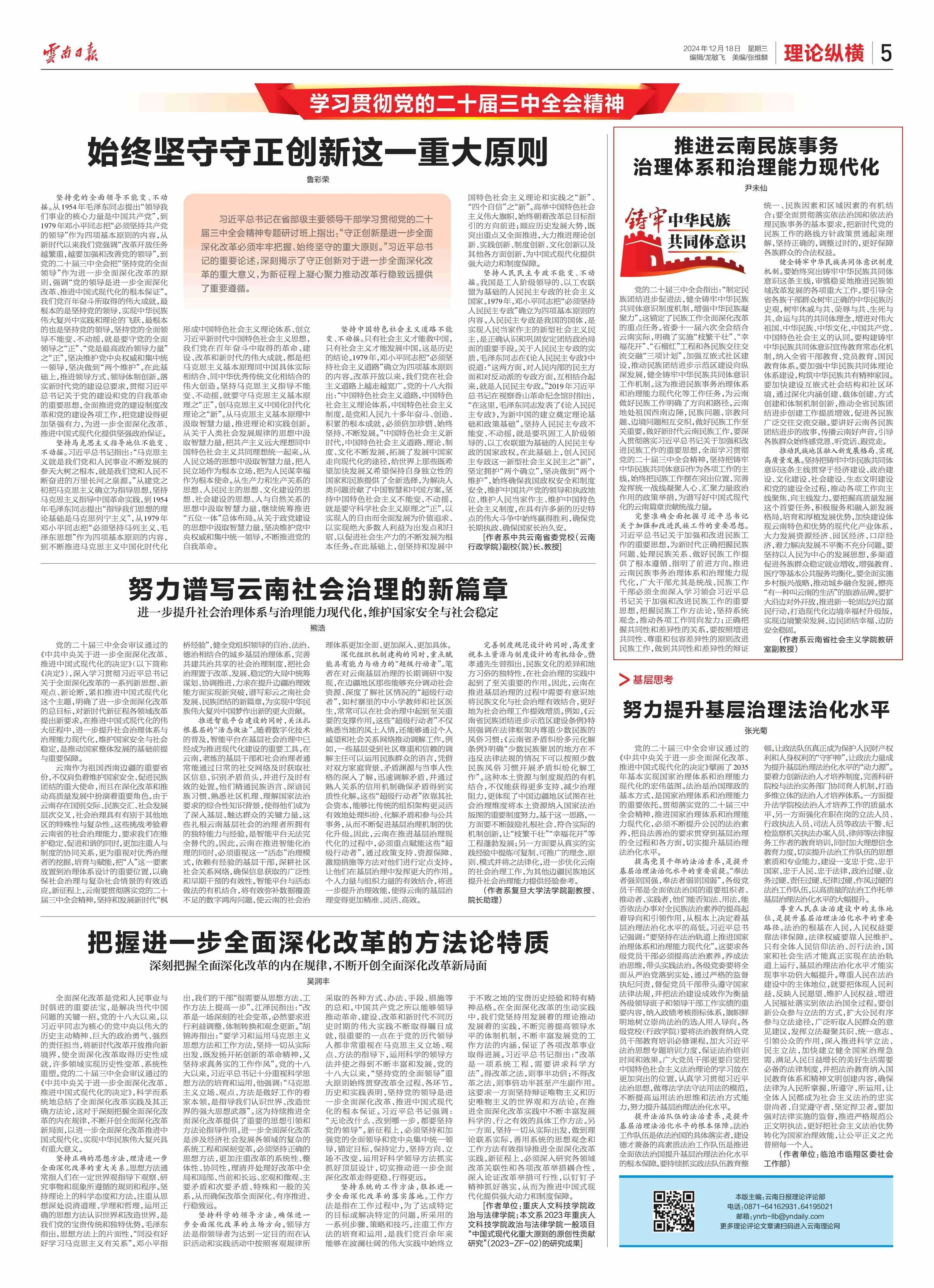 党的二十届三中全会指出:“制定民族团结进步促进法,健全铸牢中华民族共同体意识制度机制,增强中华民族凝聚力”。这锚定了民族工作全面深化改革的重点任务。省委十一届六次全会结合云南实际,明确了实施“枝繁干壮”、“幸?;?rdquo;、“石榴红”工程和各民族交往交流交融“三项计划”,加强互嵌式社区建设,推动民族团结进步示范区建设向纵深发展,健全铸牢中华民族共同体意识工作机制。这为推进民族事务治理体系和治理能力现代化等工作任务,为云南做好民族工作明确了方向和路径。云南地处祖国西南边陲,民族问题、宗教问题、边境问题相互交织,做好民族工作至关重要。做好新时代云南民族工作,要深入贯彻落实习近平总书记关于加强和改进民族工作的重要思想,全面学习贯彻党的二十届三中全会精神,坚持把铸牢中华民族共同体意识作为各项工作的主线,始终把民族工作摆在突出位置,完善发挥统一战线凝聚人心、汇聚力量政治作用的政策举措,为谱写好中国式现代化的云南篇章贡献统战力量。