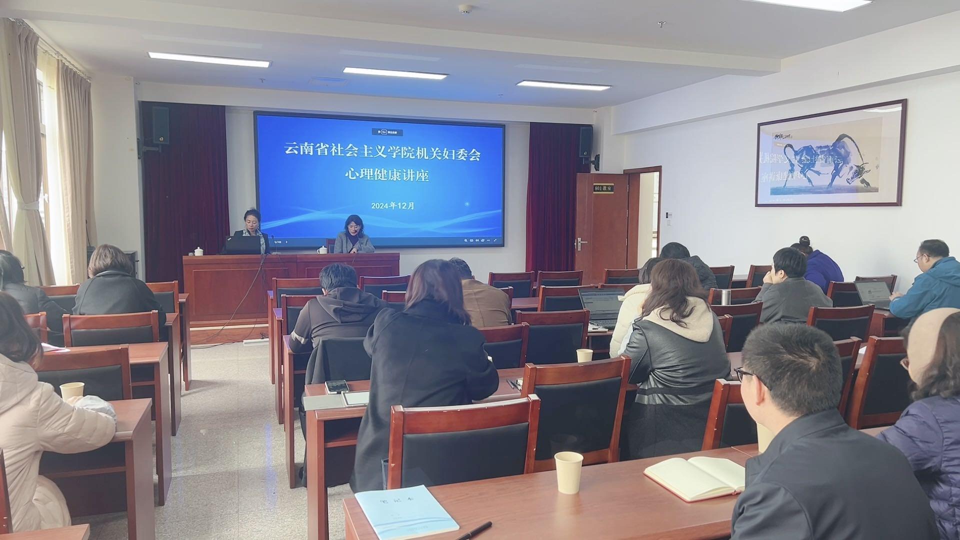 本站讯 为促进干部职工的心理健康,增强自我情绪管理和调节能力,提倡科学文明健康的生活方式,2024年12月19日,云南省社会主义学院机关妇委会邀请国家二级心理咨询师、昆明心理咨询师协会会长赵力颖为全体干部职工作“直面中年?;蘖洞尤莸ㄐ?rdquo;心理健康专题讲座。