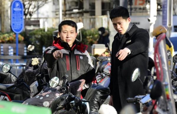 2025年1月16日,在北京朝阳区八里庄街道,一名快递员志愿者(左)与物业工作人员一起排查社区安全隐患。新华社记者 李欣 摄
