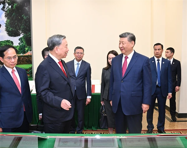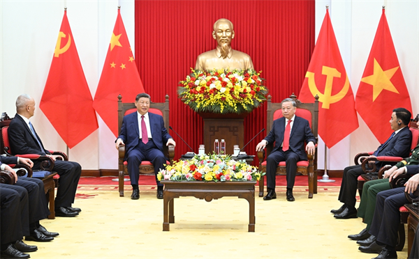习近平强调,今年是中越建交75周年暨“中越人文交流年”。75年来,无论国际风云如何变化,双方在争取国家独立和民族解放的斗争中相互支持,在社会主义建设事业中携手并进,在推进各自现代化进程中砥砺前行,成为社会主义国家团结合作的典范。面对变乱交织的国际形势,中越两国坚持和平发展,深化友好合作,为世界带来了宝贵的稳定性和确定性。站在新的历史起点上,双方要继往开来、携手前行,赓续“越中情谊深、同志加兄弟”的传统友谊,按照政治互信更高、安全合作更实、务实合作更深、民意基础更牢、多边协调配合更紧、分歧管控解决更好的“六个更”总体目标,高质量推动全面战略合作,确保中越命运共同体建设行稳致远,为构建人类命运共同体作出新的更大贡献。