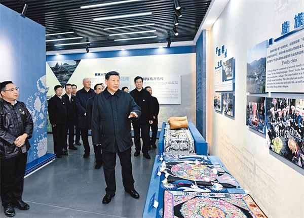 2025年3月17日至18日,中共中央总书记、国家主席、中央军委主席习近平在贵州考察。这是17日下午,习近平在黔东南州黎平县肇兴侗寨侗族文化展示中心考察。记者 谢环驰/摄