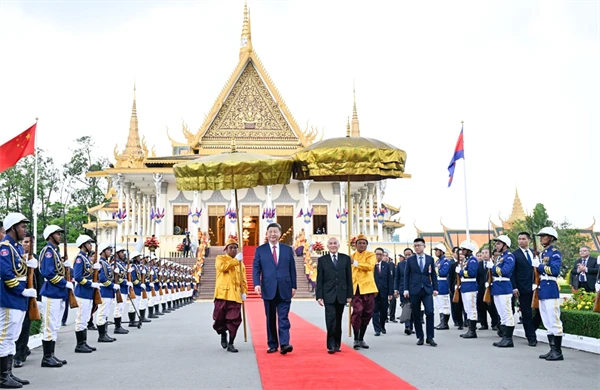 习近平指出,中柬友好跨越千年,两国人民始终双向奔赴、相互成就。无论国际风云如何变化,中柬两国坚守信义、守望相助,在涉及彼此核心利益和重大关切问题上始终坚定相互支持,树立了大小国家平等相待、真诚互信、互利共赢的典范。中柬两国始终走在构建人类命运共同体前列,给柬埔寨民众带来实实在在的好处。