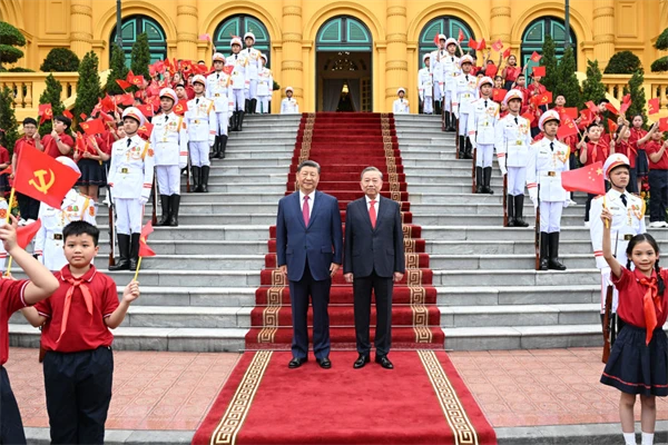 “亲密的同志和伟大的朋友”,是越方领导人对习近平总书记的亲切称呼。苏林总书记两次邀请习近平总书记茶叙,梁强国家主席、范明政总理分赴机场迎接、送行,一项项特殊礼遇满载敬意。从越南主席府到越共中央驻地,从巴亭广场到内排国际机场,一次次并肩同行,一次次热情拥抱,“越中情谊深、同志加兄弟”具象而生动。