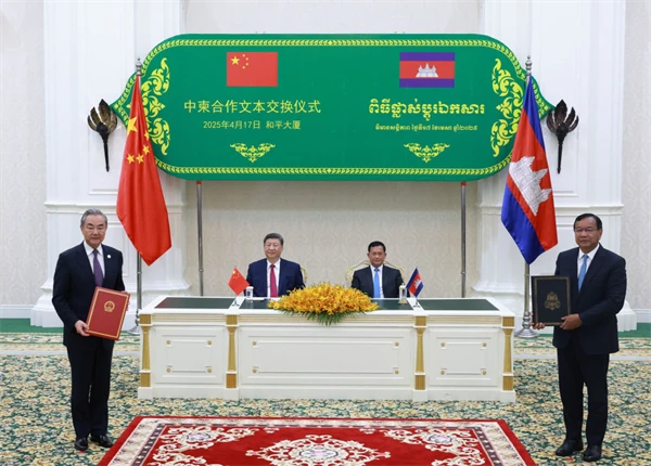 产供链合作、人工智能合作、发展援助合作、海关检验检疫合作……双方代表一次次走上大厅中央的红色方毯,交换合作文本。深化更高水平政治互信、拓展更高质量互利合作、筑牢更高层次安全保障、开展更高频率人文交流、强化更高标准战略协作,从五大领域发力,中柬关系向更高水平迈进。