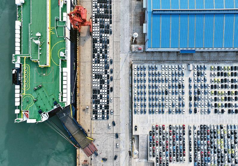 以新能源汽车为代表的“新三样”成为新时代中国制造靓丽名片。2024年,我国新能源汽车产销量均突破1200万辆。2025年1月汽车出口量为47万辆,其中新能源汽车出口15万辆,同比增长49.6%。图为2025年2月21日拍摄的江苏省连云港港东方港务分公司码头装载出口汽车的场景。 新华社发 王春/摄