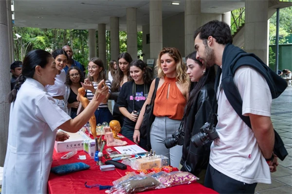 2025年4月15日,在巴西里约热内卢天主教大学举办的“国际中文日”庆?;疃?,学生们观看中医疗法展示。新华社记者 王天聪 摄