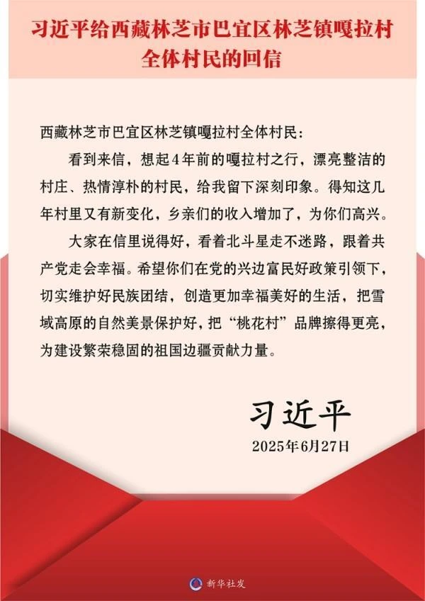 近日,中共中央总书记、国家主席、中央军委主席习近平给西藏林芝市巴宜区林芝镇嘎拉村全体村民回信,对他们提出殷切期望。