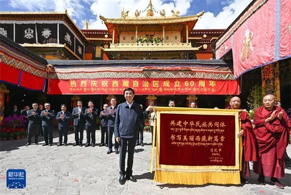 代表团看望慰问拉萨市领导班子成员及各族各界代表并合影,向拉萨市赠送习近平总书记题词“共建中华民族共同体 书写美丽西藏新篇章”贺匾。王沪宁表示,60年来,拉萨发生翻天覆地的变化,特别是党的十八大以来,拉萨经济社会发展迈上新台阶,各项事业取得新成就。新征程上,要坚持以习近平新时代中国特色社会主义思想为指导,全面贯彻新时代党的治藏方略,牢牢把握铸牢中华民族共同体意识主线,抓好稳定、发展、生态、强边四件大事,在推进西藏长治久安和高质量发展上作出新贡献。