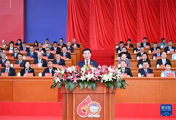 8月21日上午,西藏各族各界干部群众约2万人欢聚拉萨市布达拉宫广场,热烈庆祝西藏自治区成立60周年。中共中央政治局常委、全国政协主席、中央代表团团长王沪宁出席并讲话。新华社记者 李响 摄