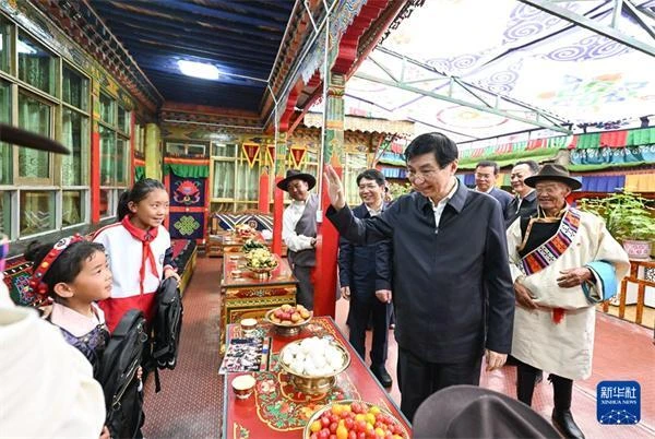 8月22日,受习近平总书记嘱托,带着党中央的亲切关怀和全国人民的深情祝福,中央代表团部分成员在日喀则看望慰问各族干部群众。这是王沪宁和中央代表团部分成员来到白朗县嘎东镇阿亚村考察乡村振兴工作,了解群众生产生活情况。新华社记者 李响 摄
