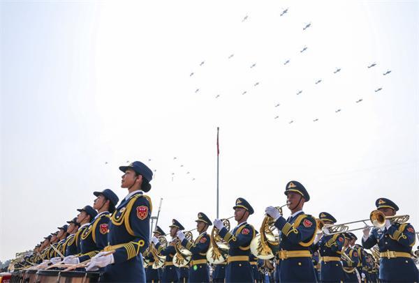 2025年9月3日,纪念中国人民抗日战争暨世界反法西斯战争胜利80周年大会在北京隆重举行。这是中国人民解放军联合军乐团和观礼的嘉宾。新华社记者 鞠焕宗 摄
