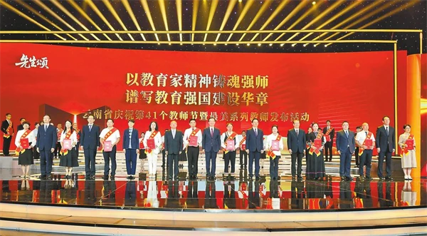 9月9日,云南省庆祝第41个教师节暨最美系列教师发布活动在昆明举行,认真学习贯彻习近平总书记重要指示精神,向全省广大教师和教育工作者致以节日祝贺和诚挚问候,勉励大家牢记总书记嘱托,大力弘扬教育家精神,牢记为党育人、为国育才的初心使命,潜心教书育人、培根铸魂,办好人民满意的教育。