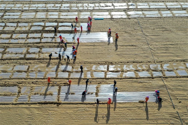 在新疆和田地区于田县沙产业实验基地,当地群众在种植薏米(2025年4月8日摄,无人机照片)。记者 丁磊 摄