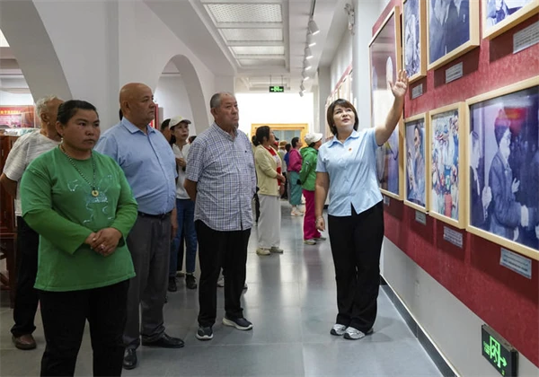 在新疆和田地区于田县库尔班·吐鲁木纪念馆,如克亚木·麦提赛地(右一)向参观者介绍展出的照片(2025年9月14日摄)。记者 丁磊 摄