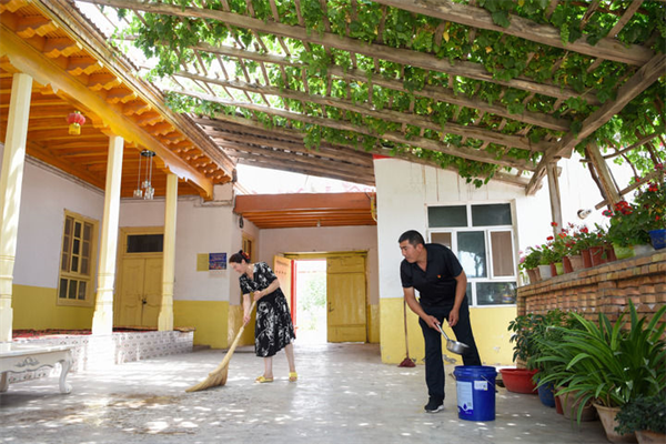 在新疆喀什地区疏附县阿亚格曼干村,村民阿卜都克尤木·肉孜(右)和妻子在打扫庭院(2022年6月10日摄)。记者 丁磊 摄