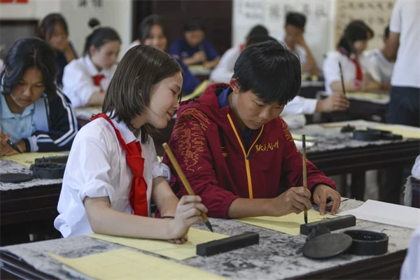 在新疆喀什地区疏附县托克扎克镇中心小学,来自贵州省黔西南布依族苗族自治州的青少年球员和小学生一起体验书法(2023年8月29日摄)。记者 郝昭 摄