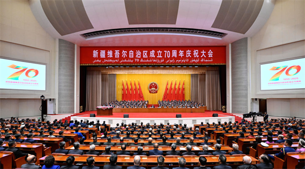 9月25日上午,新疆维吾尔自治区成立70周年庆祝大会在新疆人民会堂隆重举行。中共中央总书记、国家主席、中央军委主席习近平出席庆祝大会。王沪宁、蔡奇出席大会。新华社记者 申宏 摄