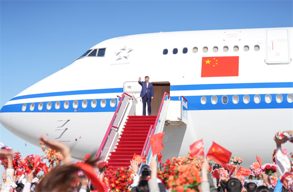 天山国际机场,习近平总书记走上舷梯,驻足于舱门前,向大家挥手道别。