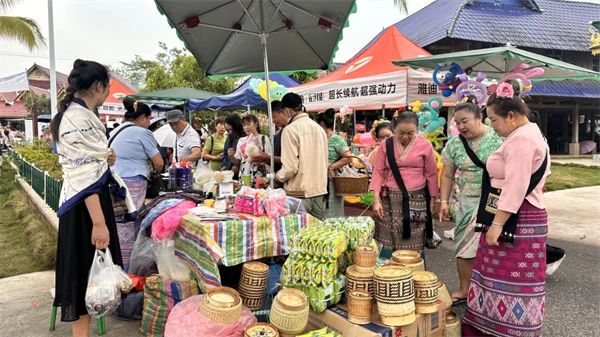 勐腊县曼烈村赶摆日,村民和游客在摊位前选购傣族特色商品和老挝货物。勐腊县委宣传部供图