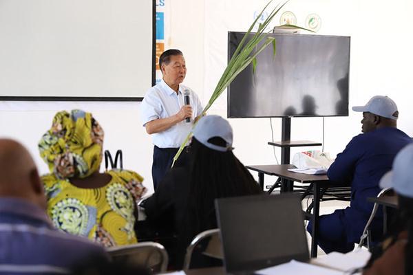2024年8月4日,在位于卢旺达南方省胡耶区的中国援卢农业技术示范中心教室,菌草发明人福建农林大学教授林占熺为培训班学员讲解菌草技术。新华社发(黄万晴摄)