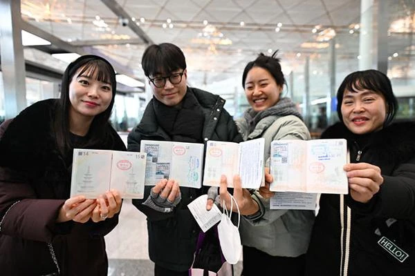 2025年1月28日,在北京首都国际机场,四名利用免签政策来中国旅游的韩国游客展示护照上的入境章。新华社记者 陈钟昊 摄